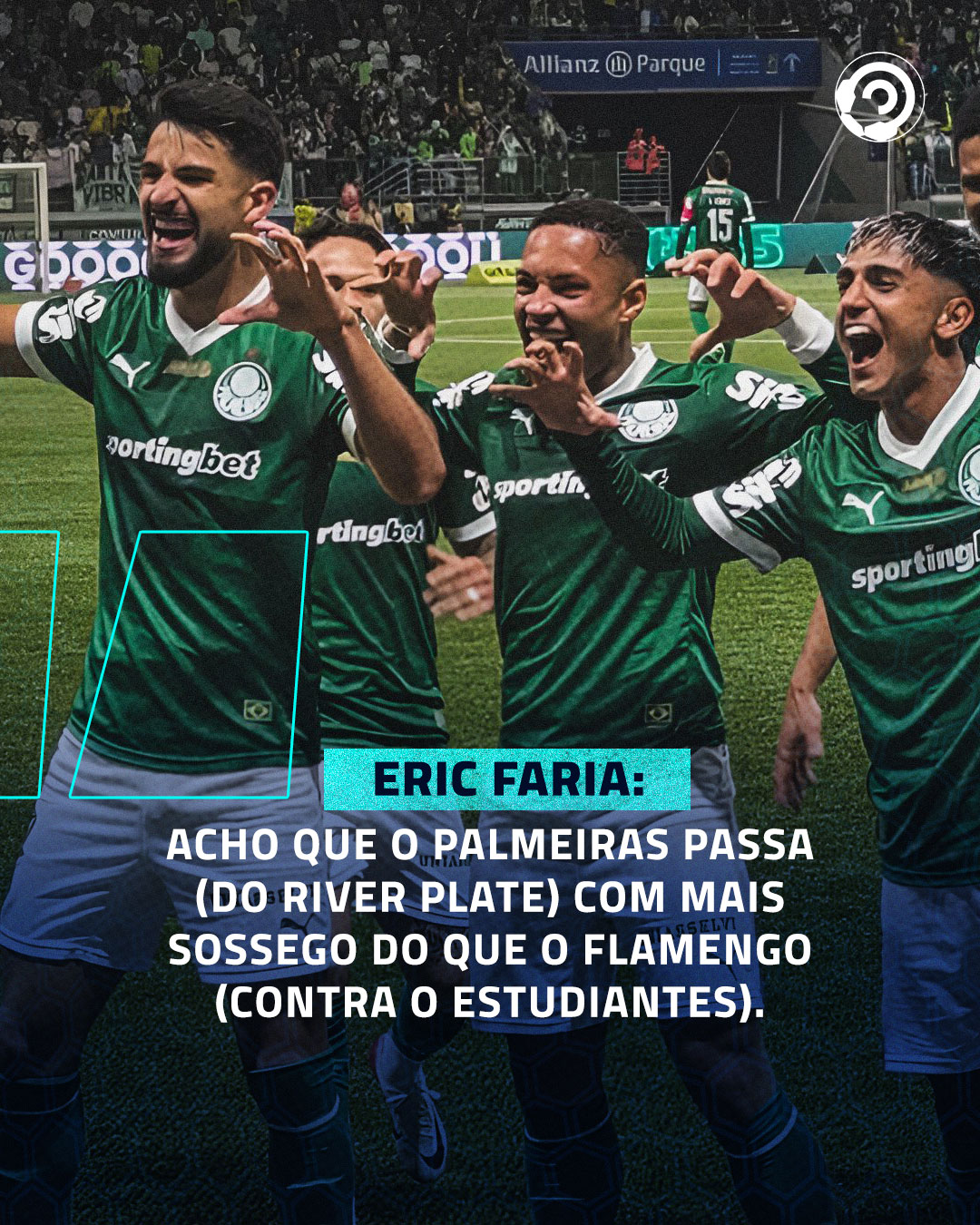 🗣 O comentarista Eric Faria acha que o Palmeiras terá mais facilidade contra o River, do que o Flamengo contra o Estudiantes.