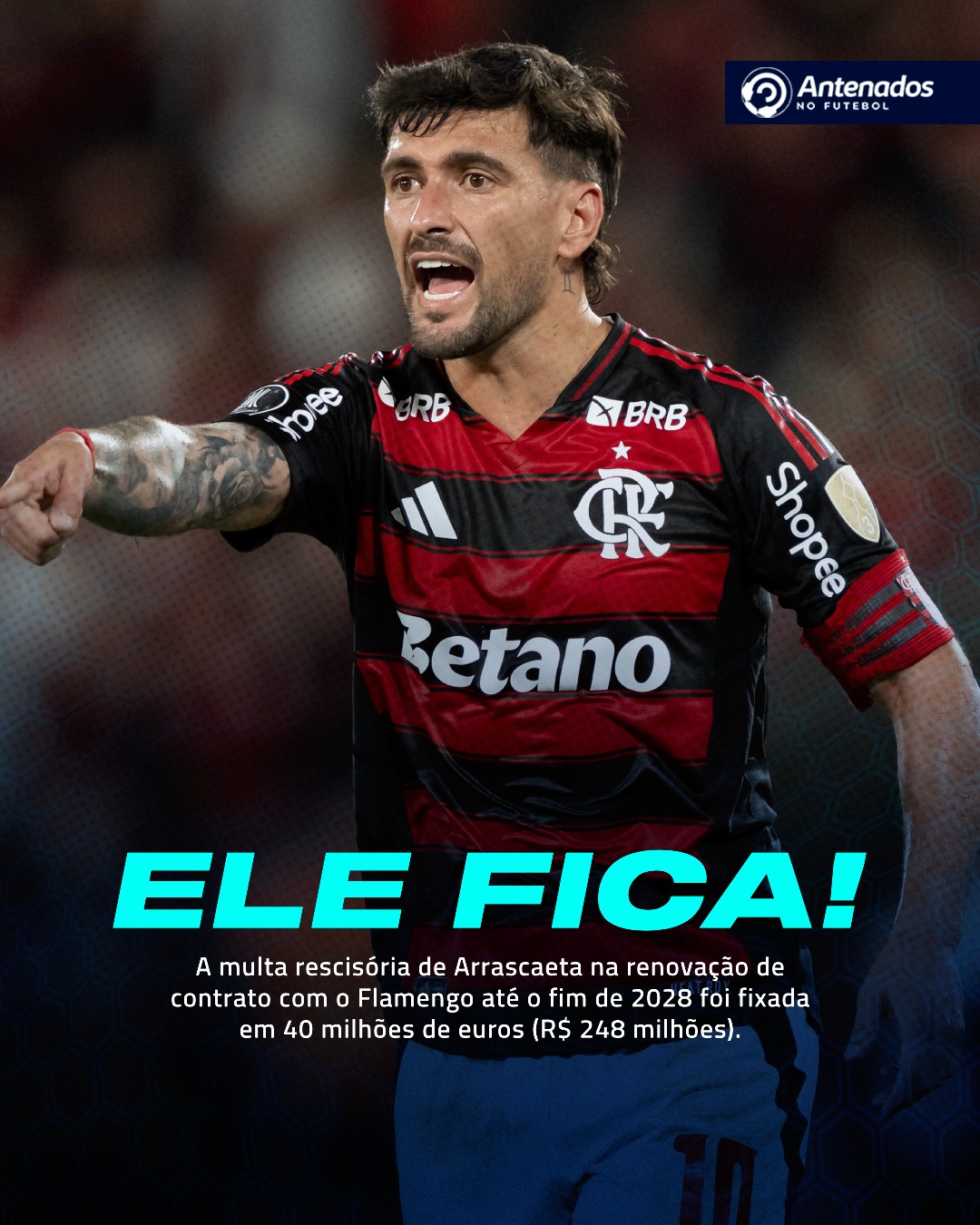 O craque uruguaio renovou contrato com o Flamengo e teve sua multa rescisória fixada em 40 milhões de euros (cerca de R$ 248 milhões). 💰⚡