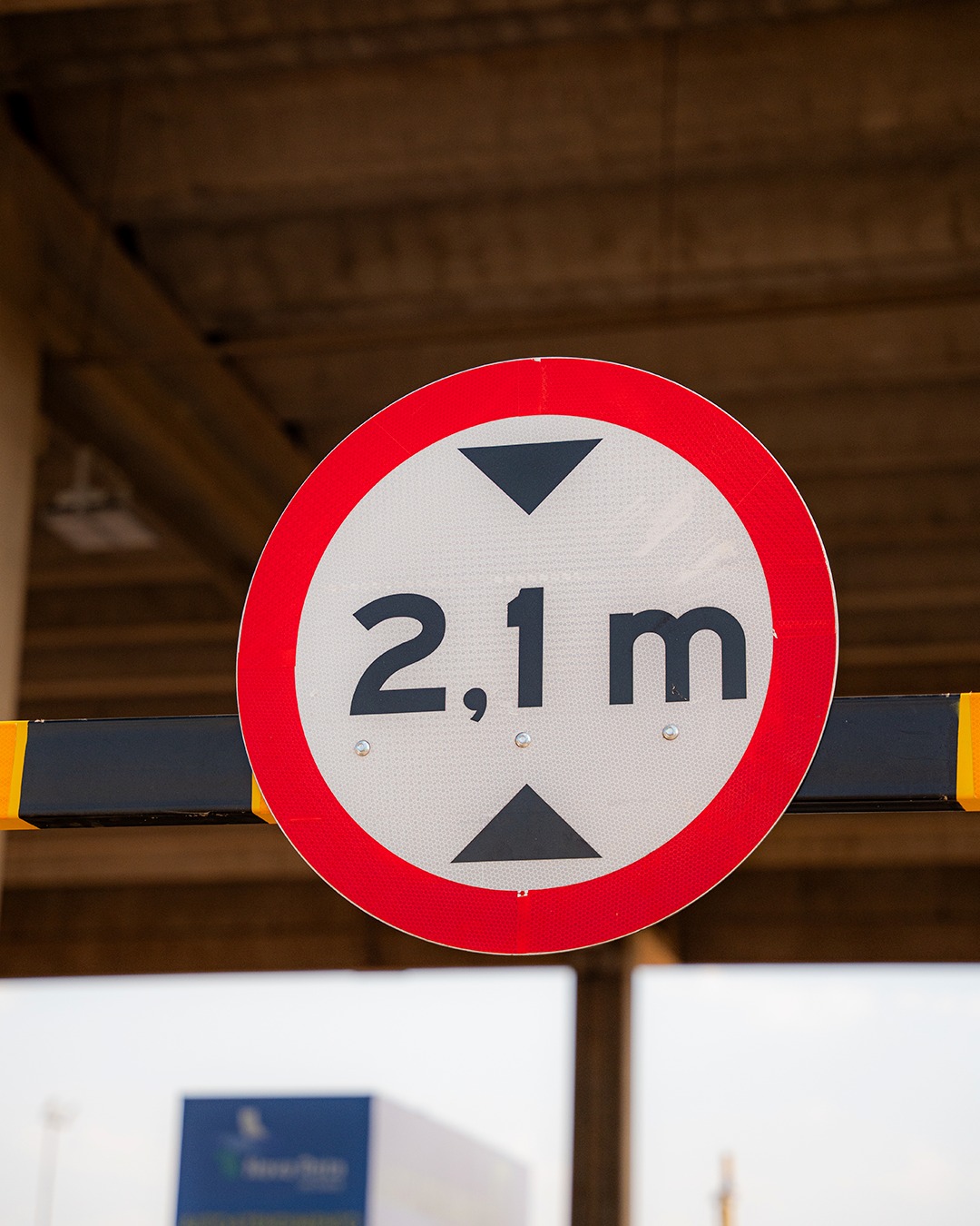1⃣ Sinalização clara: A pista é identificada com placas indicativas, limite de altura de 2,10m e é exclusiva para automóveis, utilitários e motocicletas.