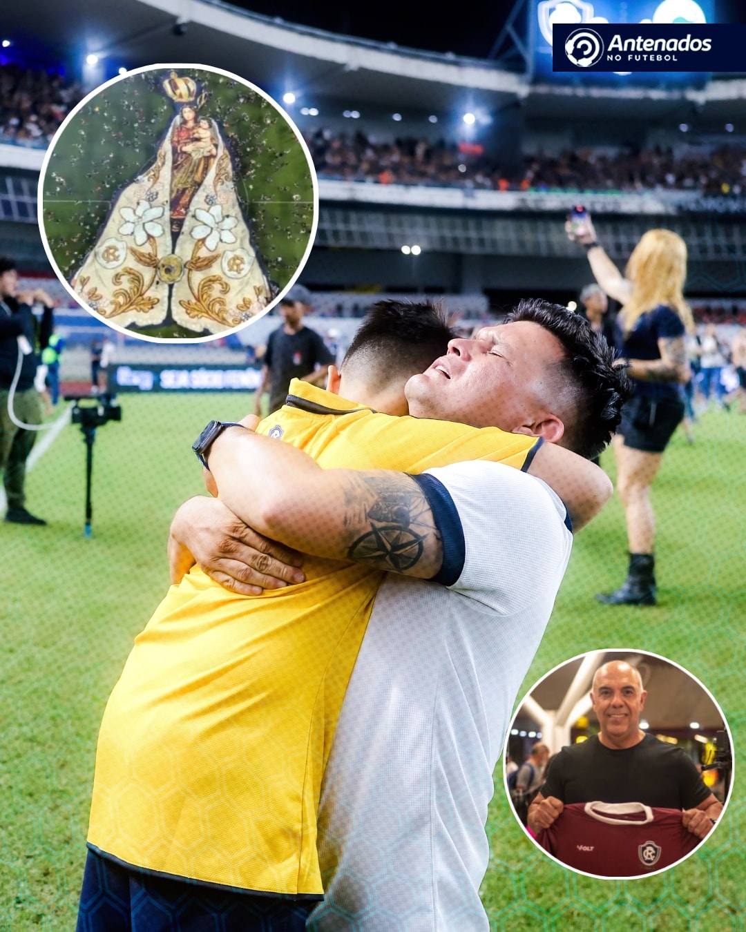 Inclusive, torcedores do Remo invadiram o gramado e estenderam uma enorme imagem de Nossa Senhora de Nazaré, no campo, na comemoração do acesso à Série A.
