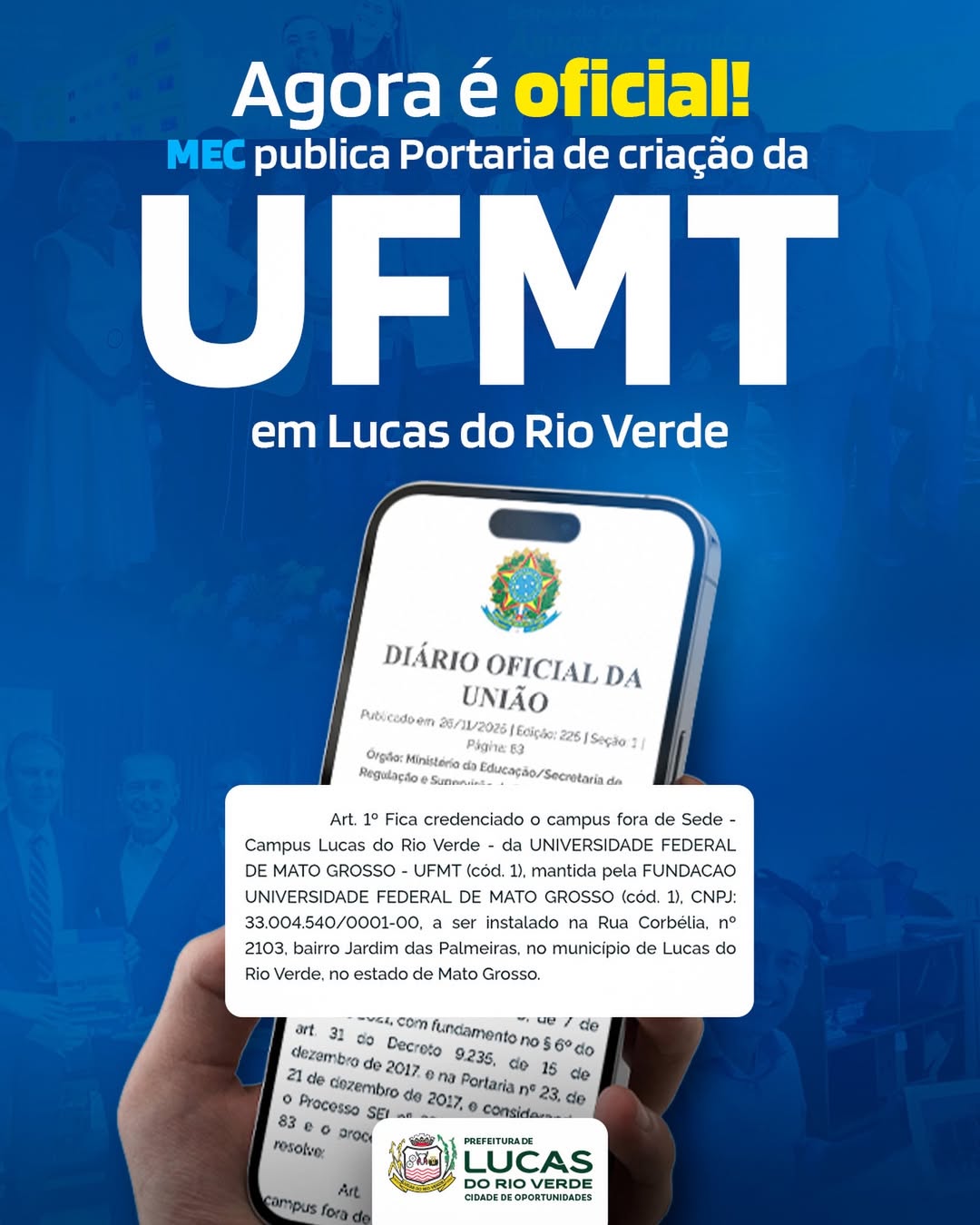 A Portaria nÂș 865 do MEC foi publicada hoje, oficializando o Campus da Universidade Federal em Lucas do Rio Verde. Uma vitĂłria gigante para a educação luverdense!