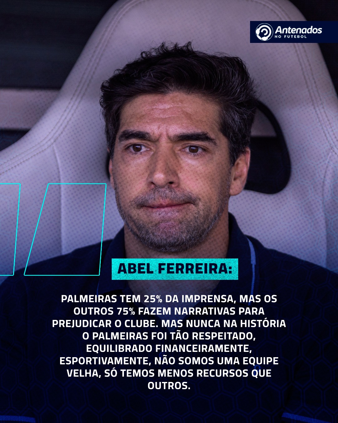 “O Palmeiras tem 25% da imprensa, mas os outros 75% fazem narrativas para prejudicar o clube. Nunca na história o Palmeiras foi tão respeitado, equilibrado financeiramente e esportivamente. Não somos uma equipe velha, só temos menos recursos que outros, mas pela estrutura que temos, conseguimos competir — e estamos há anos disputando títulos.”