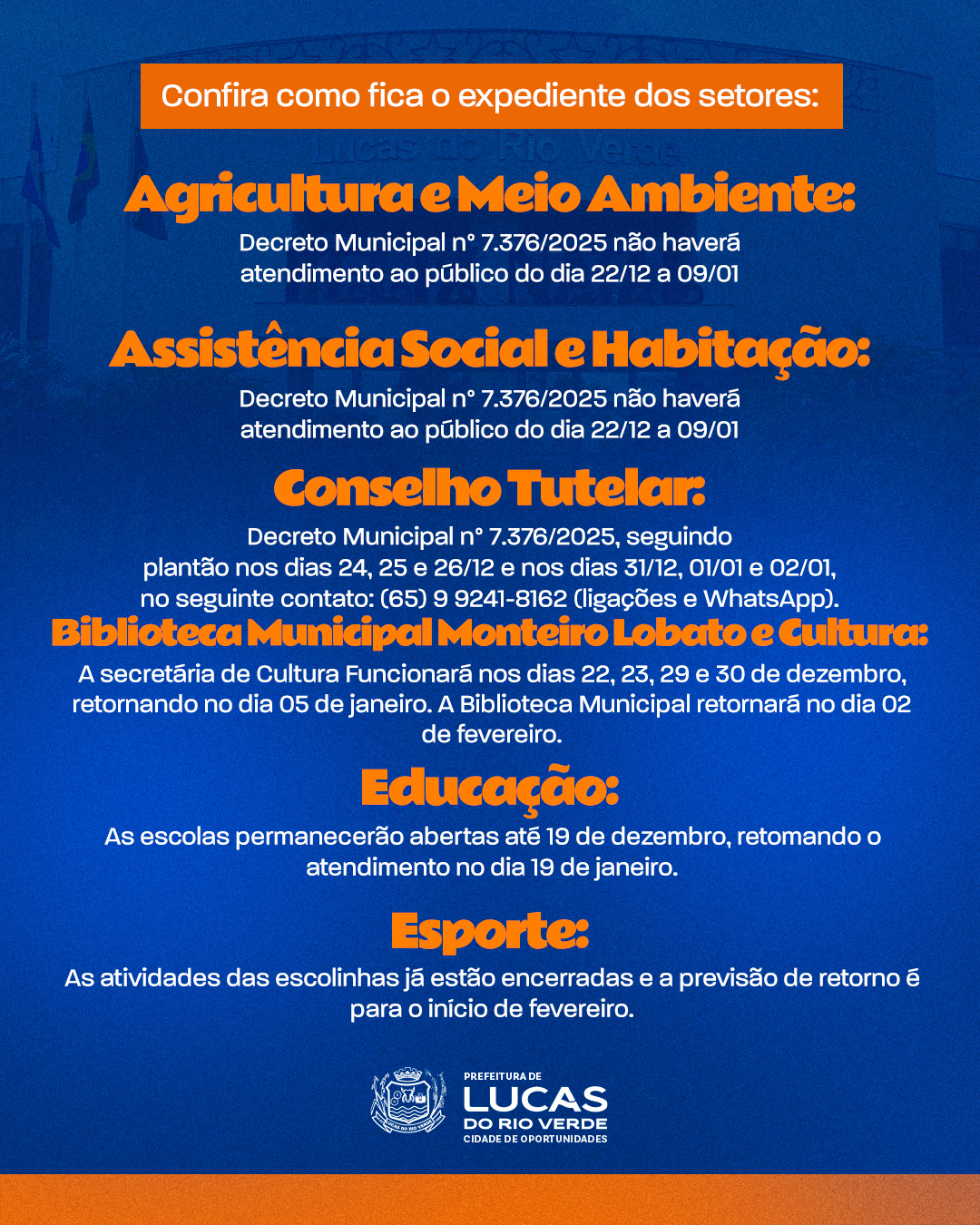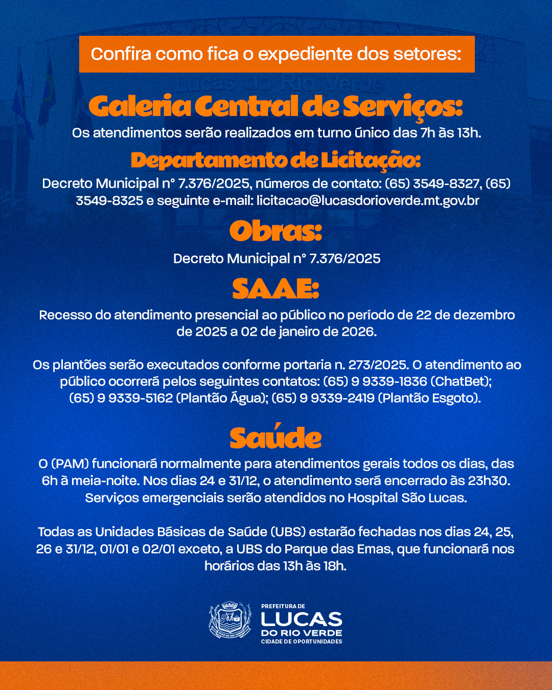 📆 EXPEDIENTE FINAL DE ANO | Confira o funcionamento da Prefeitura de Lucas do Rio Verde: